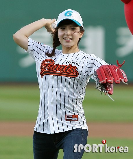 `2012 팔도 프로야구` 롯데 자이언츠와 삼성 라이온즈의 경기가 3일 오후 부산 사직야구장에서 열렸다. 경기에 앞서 SBS 신소연 기상캐스터가 시구를 선보이고 있다.