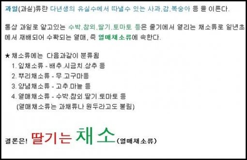 최근 온라인 커뮤니티 게시판에는 ‘딸기의 진실’이라는 제목으로 인터넷 식물도감을 캡처한 게시물이 올라왔다. 게시물에 따르면 딸기는 알고보니 과일이 아니라 야채였다는 것.