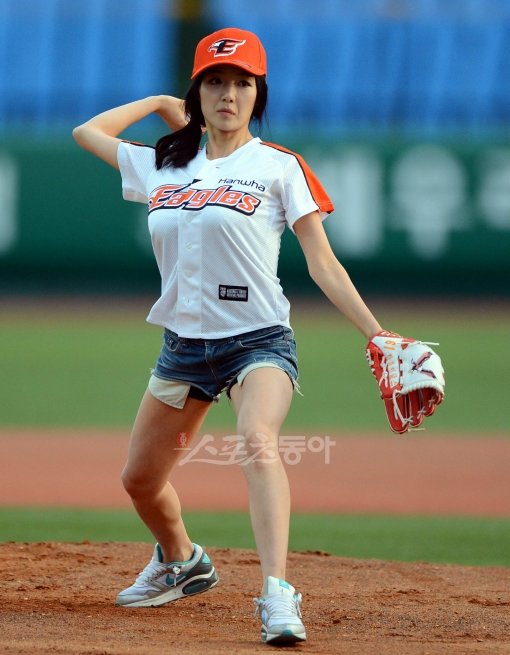 8일 저녁 대전 한밭야구장에서 열린 2012프로야구 한화와 두산의 경기에서 걸그룹 써니데이즈의 수정이 시구를 하고 있다.