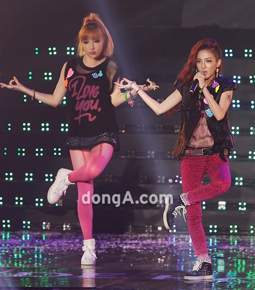 걸그룹 2NE1의 박봄(왼쪽)과 산다라박이 8일 오후 서울 송파구 올림픽공원 올림픽홀에서 열린 ‘에뛰드하우스 핑크 플레이 콘서트 3’에서 공연을 펼치고 있다.