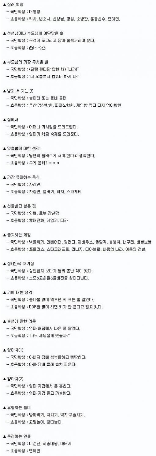 예로 국민학생이 ‘방과 후 가는 곳’은 놀이터 또는 동네 공터지만, 초등학생은 주산·암산학원, 피아노학원, 게임방 찍고 다시 영어학원이라고 적혀 있다.