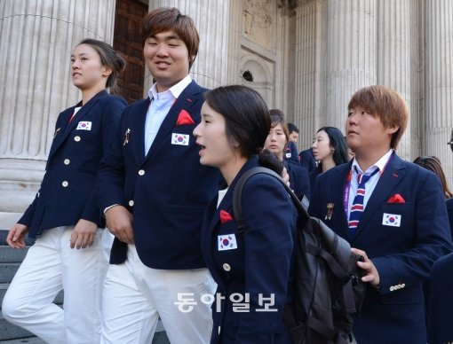 한국선수단 메달리스트들과 임원들이 런던시내 세인트 폴 대성당내에 있는 한국전 참전용사비 를 참배 헌화하고 참전용사들에게 감사의 인사를 했다. 연인관계인 양궁 기보배와 오진혁에게 보도진이 몰리자 어색해하고 있다.