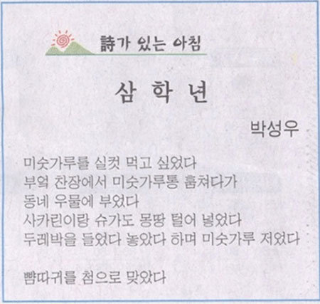 이 시는 중앙일보 ‘詩가 있는 아침’에 실렸던 시로 학생은 첫 연에서 “미숫가루를 실컷 먹고 싶었다. 부엌 찬장에서 미숫가루통을 훔쳐다가 동네 우물에 부었다. 사카린이랑 슈가도 몽땅 털어 넣었다. 두레박을 들었다 놓았다 하며 미숫가루를 저었다”라며 엉뚱한 상상을 털어놨다.