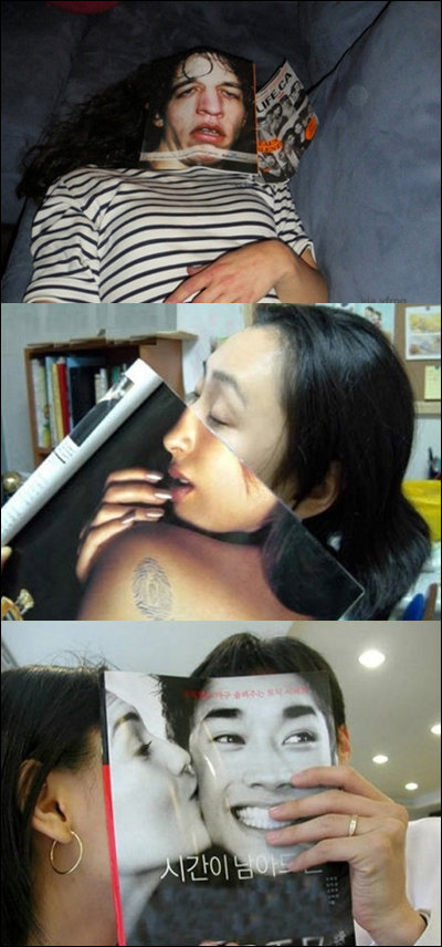 이 사진은 얼굴에 잡지책을 올려 놓고 잠든 여동생의 모습을 찍은 것으로, 책 표지속 인물의 절묘한 표정이 보는 이의 웃음보를 자극한다.