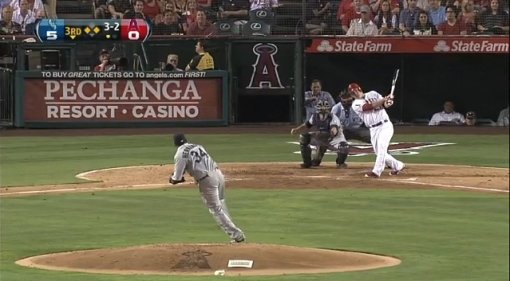 모두를 놀라게 한 장면이 나온 것은 0-5로 뒤진 3회말 공격. 트라웃은 1사 주자 1, 3루의 찬스에서 타석에 들어서 시애틀의 선발 투수 펠릭스 에르난데스(26)의 90마일짜리 공을 받아쳤다.