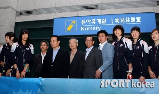 `2012 런던 올림픽` 여자배구대표팀이 13일 오후 인천 국제공항을 통해 입국한뒤 기념촬영을 하고 있다.