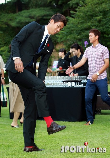 축구올림픽 대표팀 이범영이 13일 오후 서울 장충동 신라호텔에서 열린 `환영만찬` 행사에 참석해 붉은 악마를 상징하는 빨간 양말을 들어보이고 있다.
