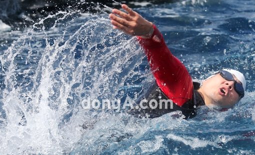 배우 송일국이 8ㆍ15 광복절을 하루 앞둔 14일 릴레이 수영을 하고 있다.