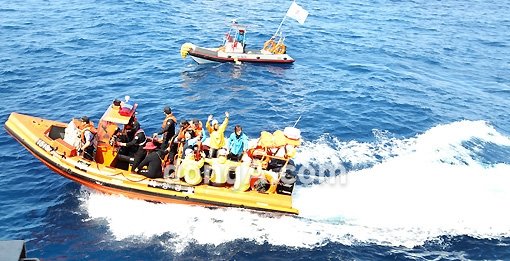 8ㆍ15 광복절을 하루 앞둔 14일 오후 가수 김장훈 등 관계자들이 릴레이 수영을 펼치기 위해 해상으로 나가고 있다.