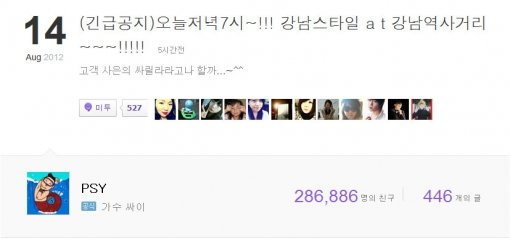 싸이는 같은날 오후 자신의 미투데이에 “오늘 저녁 7시. 강남스타일 at 강남역 사거리. 고객 사은의 싸릴라라고나 할까”라며 긴급 공지했다.