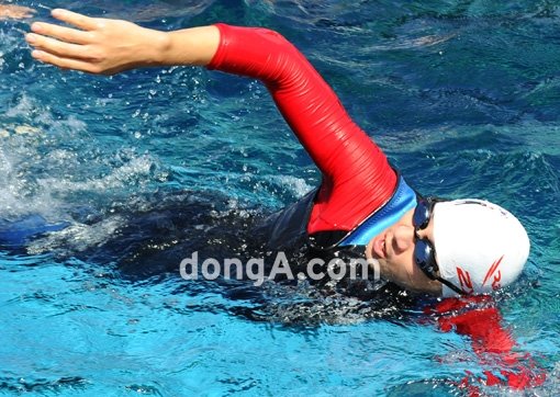 배우 송일국이 8ㆍ15 광복절을 하루 앞둔 14일 릴레이 수영을 하고 있다.