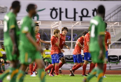 K리그 선수들로만 구성된 한국 축구대표팀이 15일 오후 8시 안양 종합운동장에서 FIFA 랭킹 44위 잠비아와 평가전을 가졌다. 한국 이근호가 전반 선제 헤딩골을 성공시킨 후 동료들의 축하를 받고 있다.