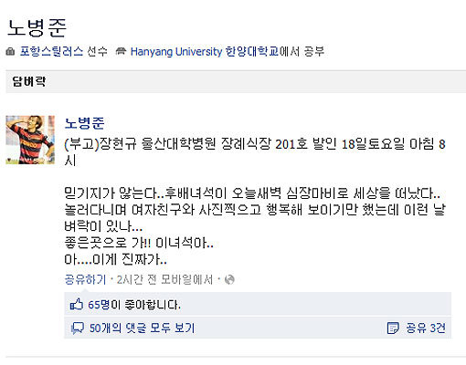 프로축구 포항 스틸러스의 노병준이 과거 팀 후배였던 장현규의 사망에 비통한 심정을 드러냈다.