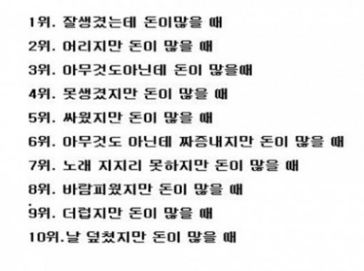 ‘여자가 반하는 남자 순위’ 게시물에 따르면 여자가 반하는 남자 순위 1은 ‘잘생겼는데 돈이 많을 때’다. 이어 ‘어리지만 돈이 많을 때’ ‘아무것도 아닌데 돈이 많을 때’ ‘못생겼지만 돈이 많을 때’ 등이다.