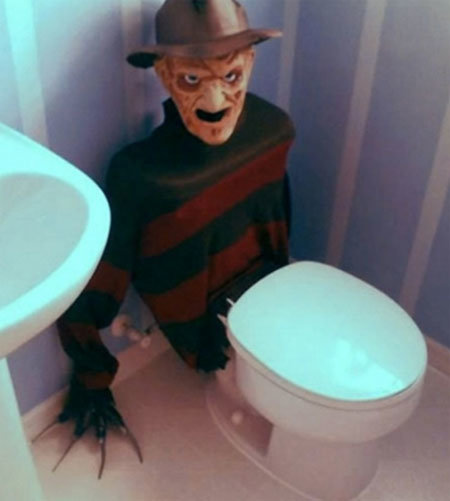 공개된 사진 속에는 공포 영화 ‘나이트메어’에 나오는 살인마 프레디 크루거 커버가 씌워진 화장실 변기 모습이 담겨 있다. 프레디 크루거의 강렬한 눈빛이 마치 공포 영화를 보는 듯 오싹한 분위기를 자아내고 있다.