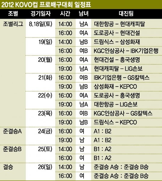한국배구연맹(KOVO) 컵대회인 ‘2012 수원컵 프로배구대회’가 18∼26일까지 수원실내체육관에서 치러진다. 컵대회는 2012∼2013시즌 프로배구의 판도 변화를 가늠할 수 있는 시범경기 성격의 대회다. 올해는 남녀 각 6개팀이 2개조로 나뉘어 조별리그를 펼치고, 각조 1,2위가 4강 크로스 토너먼트로 우승팀을 가린다. 남녀부 관전 포인트를 짚어본다.