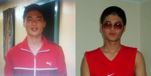 사진 속 기성용은 빨간색 트레이닝 복 차림으로 약간은 촌스러운 모습을 하고 있고, 다른 사진에서는 역시 빨간색 민소매 상의에 역시 세련미와는 거리가 먼 선글라스를 착용하고 있다.