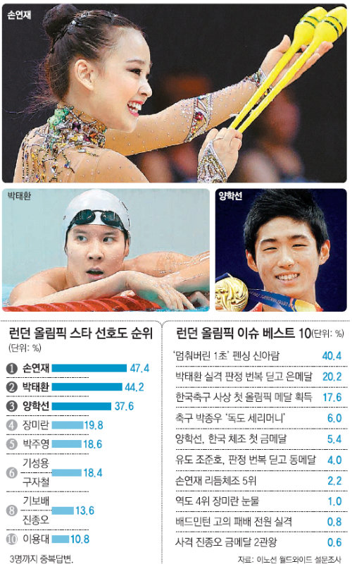광고대행사 이노션 월드와이드는 런던 올림픽 폐막 직후인 13, 14일 20∼50대 남녀 500명을 대상으로 실시한 런던 올림픽 스타 선호도 조사에서 이같이 나타났다고 19일 밝혔다. 올림픽 이전에도 국민적인 인기를 누리던 손 선수는 한국 리듬체조 역사상 처음으로 올림픽 결선에 진출해 5위를 차지면서 더 큰 인기를 누리는 것으로 분석된다.