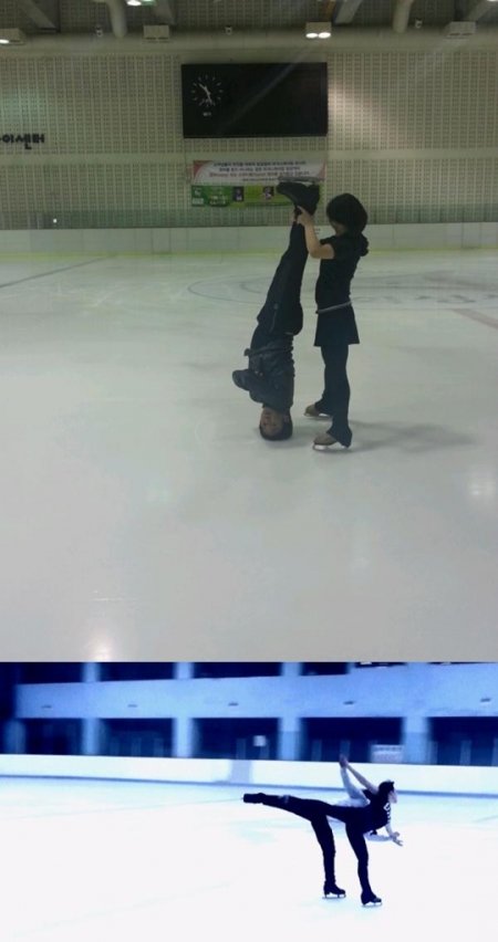 사진에서 김병만은 ‘키스 앤 크라이’ 당시 전체 코칭을 맡았던 양태화 스케이팅 코치와 함께 연습에 몰두하고 있다. 비전문가에겐 버거운 빙판 위에서 물구나무 자세까지 취해 보는 이를 감탄시킨다.