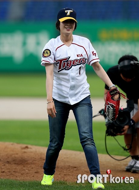 `2012 팔도 프로야구` KIA 타이거즈와 LG 트윈스의 경기가 21일 오후 광주 무등야구장에서 열렸다. 경기에 앞서 런던 올림픽 여자양궁 2관왕 기보배가 멋진 시구를 선보인 후 멋적은 미소를 짓고 있다.