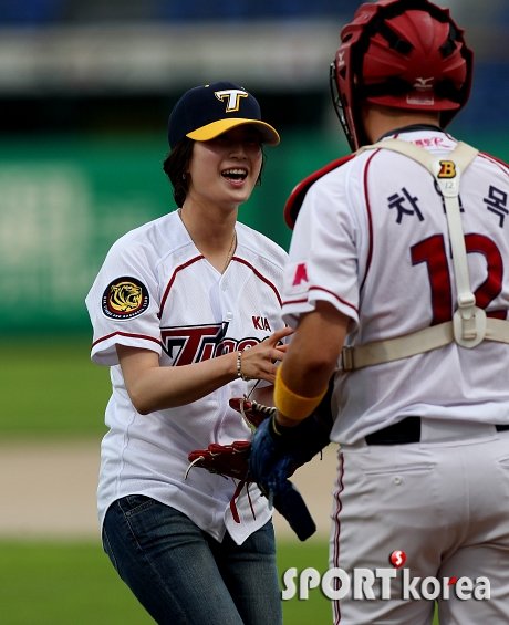 `2012 팔도 프로야구` KIA 타이거즈와 LG 트윈스의 경기가 21일 오후 광주 무등야구장에서 열렸다. 경기에 앞서 런던 올림픽 여자양궁 2관왕 기보배가 멋진 시구를 선보인 후 기념볼을 받고 있다.