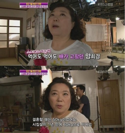 양희경은 22일 방송된 KBS 2TV ‘여유만만’에 출연해 “결혼 후 시집살이 스트레스 때문에 한 달에 1kg씩 쪘다”라고 말했다.