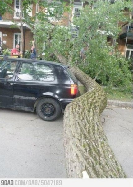 그대로 나무에 깔려야 할 운명 이었지만 나무가 중간에 약간 휘어진 덕에 차가 참사를 피할 수 있었던 것으로 보인다.