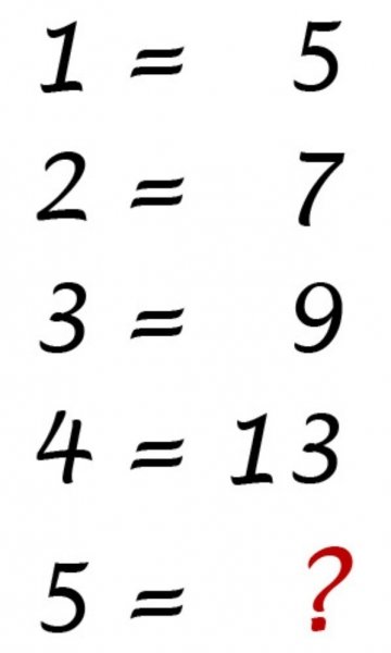 사진은 ‘1=5’를 시작으로 2=7, 3=9, 4=13, 5=? 로 구성 돼 있다. 결국 5는 무엇이냐는 게 이 문제의 핵심.