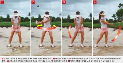 김하늘은 “벙커의 모래가 부드럽기 때문에 몸을 많이 움직일수록 공을 정확하게 때리기 어려워진다. 아마추어 골퍼들이 벙커에서 한번에 탈출하지 못하고 실수를 되풀이하는 가장 큰 이유는 스윙 중 몸이 좌우로 흔들려 정확하게 공을 때리지 못하기 때문이다. 하체를 고정하고 몸의 움직임을 줄이면 일관된 스윙을 하는 데 도움이 된다”고 말했다.도움말 | KLPGA 프로골퍼 김하늘