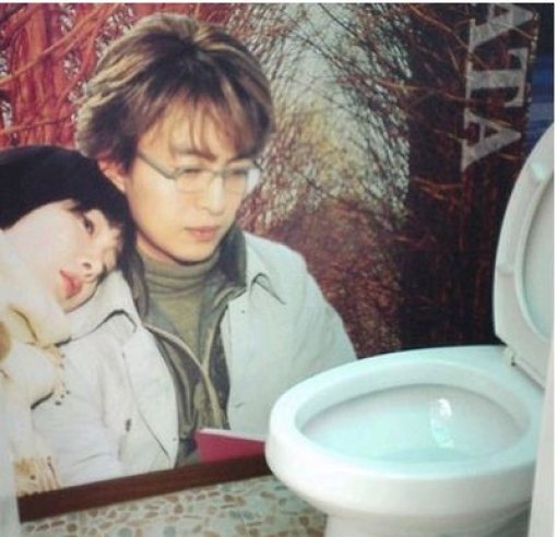 주인공이었던 배용준 최지우의 모습이 담긴 포스터가 붙어 있는 것이다. 또한 두 주인공의 시선이 절묘하게 변기로 향하고 있어 이용자라면 민망해 할 수 밖에 없는 구조.
