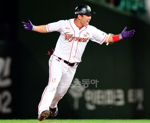 22일 오후 인천 문학야구장에서 '2012 팔도 프로야구' SK 와이번스와 한화 이글스의 경기가 열렸다. 연장 11회말 1사 만루에서 SK 정근우가 끝내기 번트를 성공한 뒤 환호하고 있다. 문학|김민성 기자 marineboy@donga.com 트위터 @bluemarine007