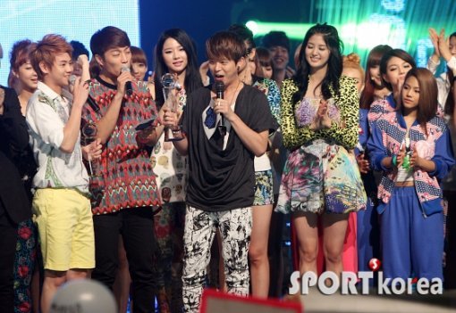 MC 토니(가운데)가 23일 오후 서울 상암동 CJ E&M 센터에서 열린 Mnet ‘엠카운트다운’(엠카)의 마지막 진행을 마친 후 `최고의 MC상`을 받고 있다.