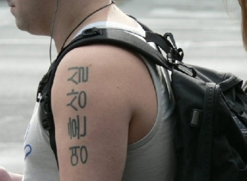 공개된 사진 속 외국인들은 그림이나 자국어 대신 한글을 몸에 새겨넣었다. 특히 외국인들의 몸에 새겨진 한글이 눈에 띈다. ‘영혼상실’, ‘한국횟집’ 등의 글자가 대부분인 것.