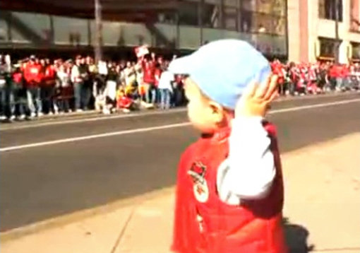 공개한 영상에는 생후 22개월의 아기가 길 건너편에 모여 있는 사람들을 바라보며 손을 들고 있는 모습이 담겨 있다. 아기가 손을 들자 맞은편에 있는 사람들은 만세를 하며 크게 환호성을 지른다.