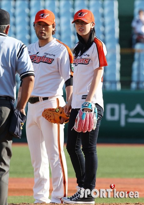 `2012 팔도 프로야구` 한화 이글스와 KIA 타이거즈의 경기가 26일 오후 대전 한밭야구장에서 열렸다. 경기에 앞서 2012 런던올림픽 여자 펜셍 에페 단체 은메달리스트 신아람이 멋진 시구를 선보이고 있다.