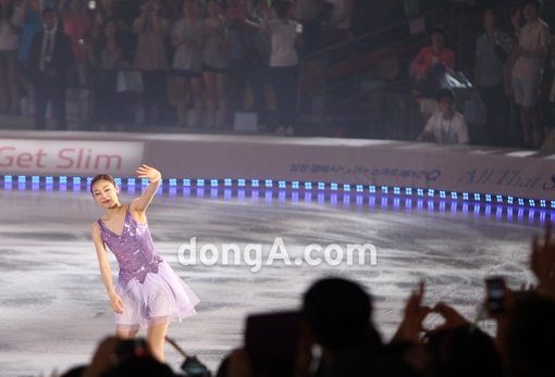 피겨퀸 김연아가 26일 오후 서울 송파구 방이동 올림픽 체조경기장 특설 아이스링크에서 열린 ‘올댓스케이트 서머 2012’아이스쇼에서 관객을 향해 인사를 하고 있다. 김연아는 록산느의 탱고를 5년만에 재현해 팬들을 열광시켰다.