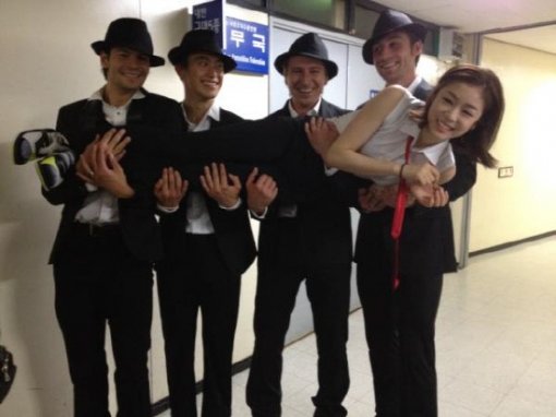 사진에서 정장을 갖춰 입은 남자 피겨 스케이터들은 나란히 서서 김연아를 들고 있다. 이는 흔히 대어를 낚았을 때 낚시꾼들이 취하는 포즈다. 사진은 최근 열린 ‘올댓스케이트 서머 2012’ 아이스쇼 1부가 끝난 뒤 촬영된 것으로 보인다. 이들 5명은 1부 마지막 순서로 김연아의 ‘올 오브 미’ 공연에서 전원 정장 차림으로 출연하기 때문.