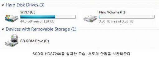 부팅속도를 빠르게 하기위해 PC에 SSD를 설치하고, 여기에 저장공간을 확보하고자 HDS7240을 더했다. SSD 때문에 윈도를 고작 20초만에 부팅할 수 있었고 포토샵도 눈깜짝할 새에 실행할 수 있었다. 그럼에도 HDS7240 때문에 용량은 매우 넉넉했다. 둘의 조합이 매우 좋다. 그야말로 찰떡궁합이다.