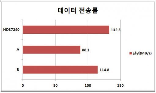 먼저 데이터 전송률의 경우, HDS7240은 평균 132.5MB/s로 나타났다. 타사의 하드디스크 A는 88.1 MB/s, B는 114.8MB/s로 나타났다(A는 상당기간 사용한 제품이고 B는 새제품이다. 하드디스크는 사용하면 사용할수록 성능이 저하된다). 타사 하드디스크보다 상당히 빠른 것을 확인할 수 있었다.