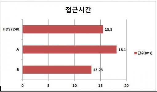 접근 시간의 경우 HDS7240은 15.5ms로 나타났다. 타사 하드디스크 A는 18.1ms, B는 13.2ms로 나타났다. 상당기간 사용한 제품보다는 빨랐지만 새 제품보다는 약간 느렸다. 그러나 이정도의 사소한(?) 차이를 사용자가 체감하기란 쉽지 않을 것 같다.