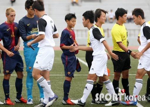 27일 전남 강진군 강진종합운동장에서 열린 `제7회 한국중등(U-15)축구연맹회장배 겸 전라남도지사배 국제축구대회` 스페인FC바르셀로나와 한국중등연맹U-15대표팀의 경기에서 바르셀로나의 백승호(15)가 한국대표와 인사를 나누고 있다.