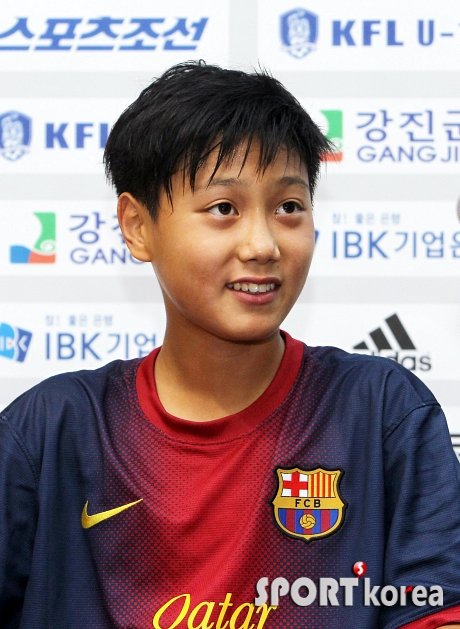 27일 전남 강진군 강진종합운동장에서 열린 `제7회 한국중등(U-15)축구연맹회장배 겸 전라남도지사배 국제축구대회` 미디어 데이에서 FC 바르셀로나 백승호가 자리에서 밝은 표정을 짓고 있다.