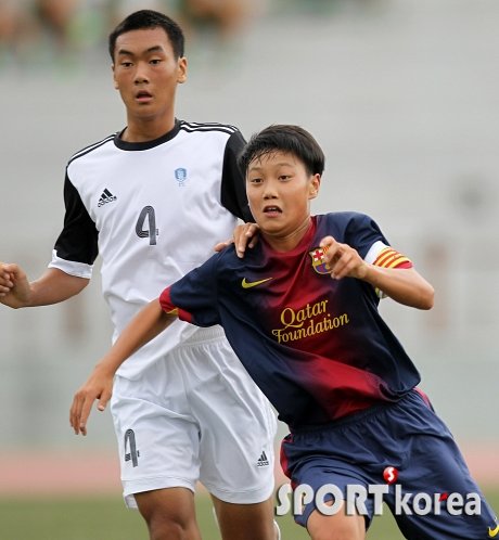 27일 전남 강진군 강진종합운동장에서 열린 `제7회 한국중등(U-15)축구연맹회장배 겸 전라남도지사배 국제축구대회` 스페인FC바르셀로나와 한국중등연맹U-15대표팀의 경기에서 바르셀로나의 백승호(15)가 주장완장을 차고 한국대표 이동진에 앞서 볼을 향해 뛰어나가고 있다.