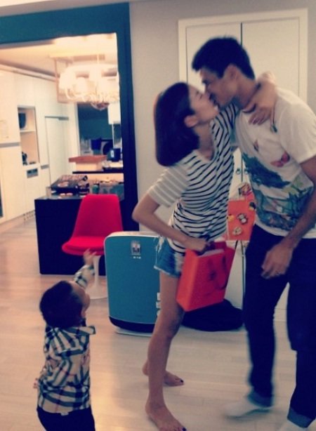 사진 속 김성은은 선물이 들어 있는 쇼핑백을 한 손에 들고 정조국의 목을 감싸 안고 입을 맞추고 있는 모습이다. 특히 옆에 서있는 아들이 물끄러미 두 사람을 바라보며 손을 뻗고 있어 눈길을 끌고 있다.