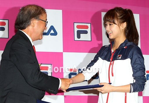 휠라 윤윤수 회장과 손연재가 협약서를 전달하고 있다. 손연재는 향후 2년간 대회와 훈련에 필요한 의류 및 용품 일체를 후원받게 된다.