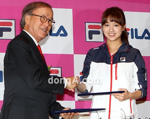 휠라 윤윤수 회장과 손연재가 협약서를 전달하고 있다. 손연재는 향후 2년간 대회와 훈련에 필요한 의류 및 용품 일체를 후원받게 된다.