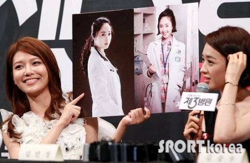 소녀시대 수영(왼쪽)이 29일 오후 서울 논현동 임피리얼팰리스호텔에서 열린 드라마 tvN ‘제3병원’ 제작발표회에 참석해 김민정의 3년전 사진을 보여주고 있다.