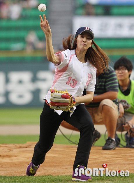 `2012 팔도 프로야구` 두산 베어스와 LG 트윈스의 경기가 29일 오후 잠실 야구장에서 열렸다. 경기에 앞서 퀸즈데이를 맞아 2012 런던올림픽 여자 태권도 금메달리스트 황경선이 멋진 시구를 선보이고 있다.