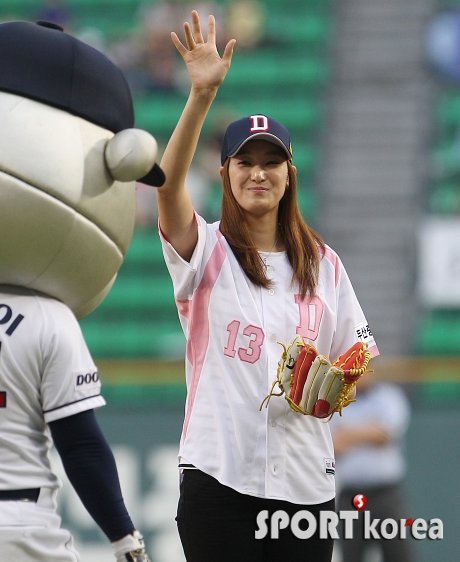 `2012 팔도 프로야구` 두산 베어스와 LG 트윈스의 경기가 29일 오후 잠실 야구장에서 열렸다. 경기에 앞서 퀸즈데이를 맞아 시구에 나선 2012 런던올림픽 여자 태권도 금메달리스트 황경선이 팬들을 향해 인사를 하고 있다.