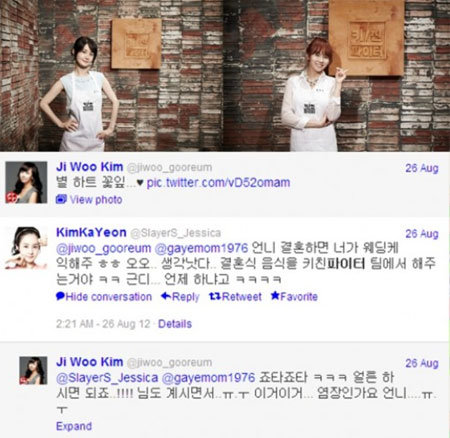 먼저 김지우는 “베이킹을 전문 과정까지 배웠다”며 별과 하트 모양의 미니 케이크 사진을 올렸다. 이에 김가연이 자신의 트위터(@SlayerS_Jessica)를 통해 “언니 결혼하면 네가 웨딩 케이크 해줘”라며 “오오 생각났다. 결혼식 음식을 ‘키친 파이터’팀에서 해주는 거야 ㅋㅋ 근데 언제 하냐고”라고 대화를 건네 눈길을 끌었다.